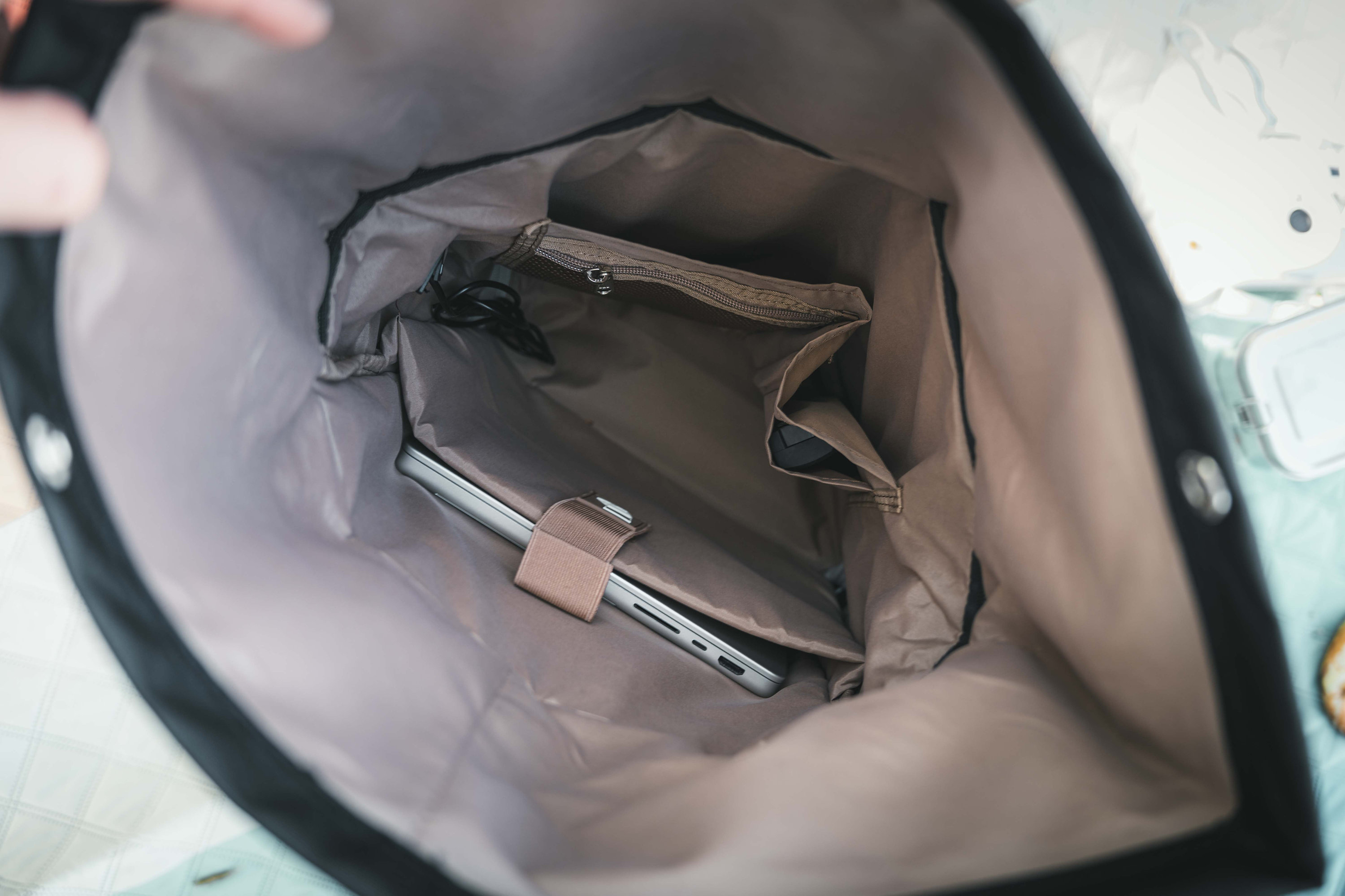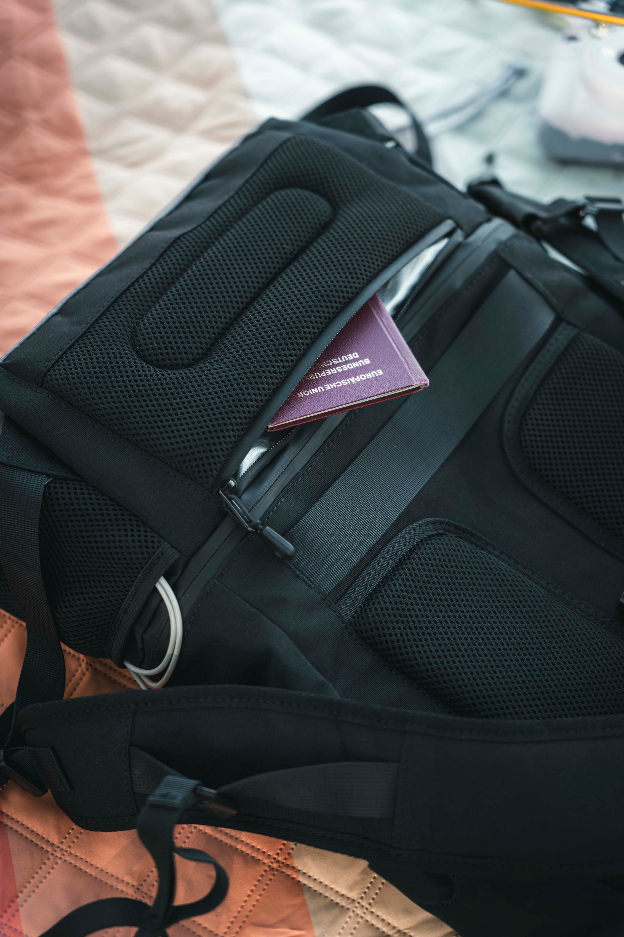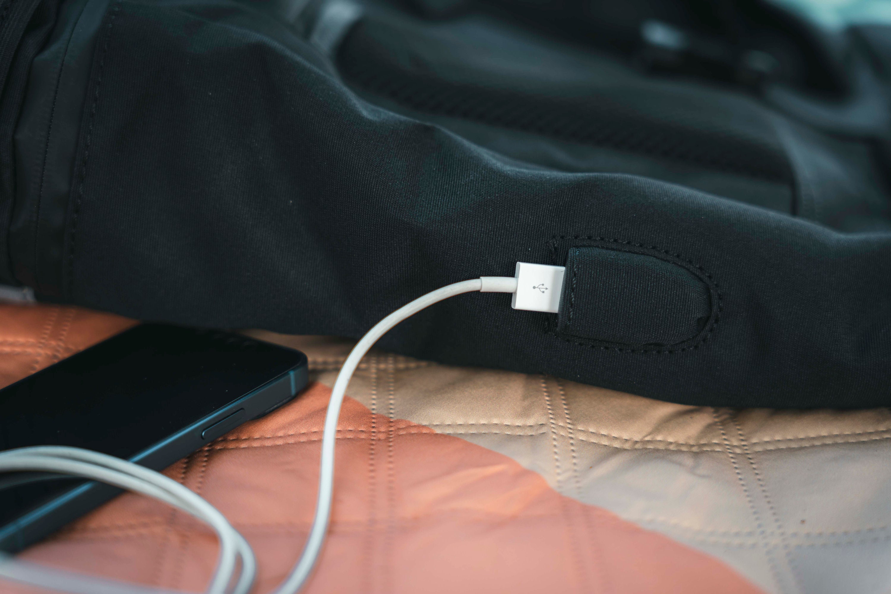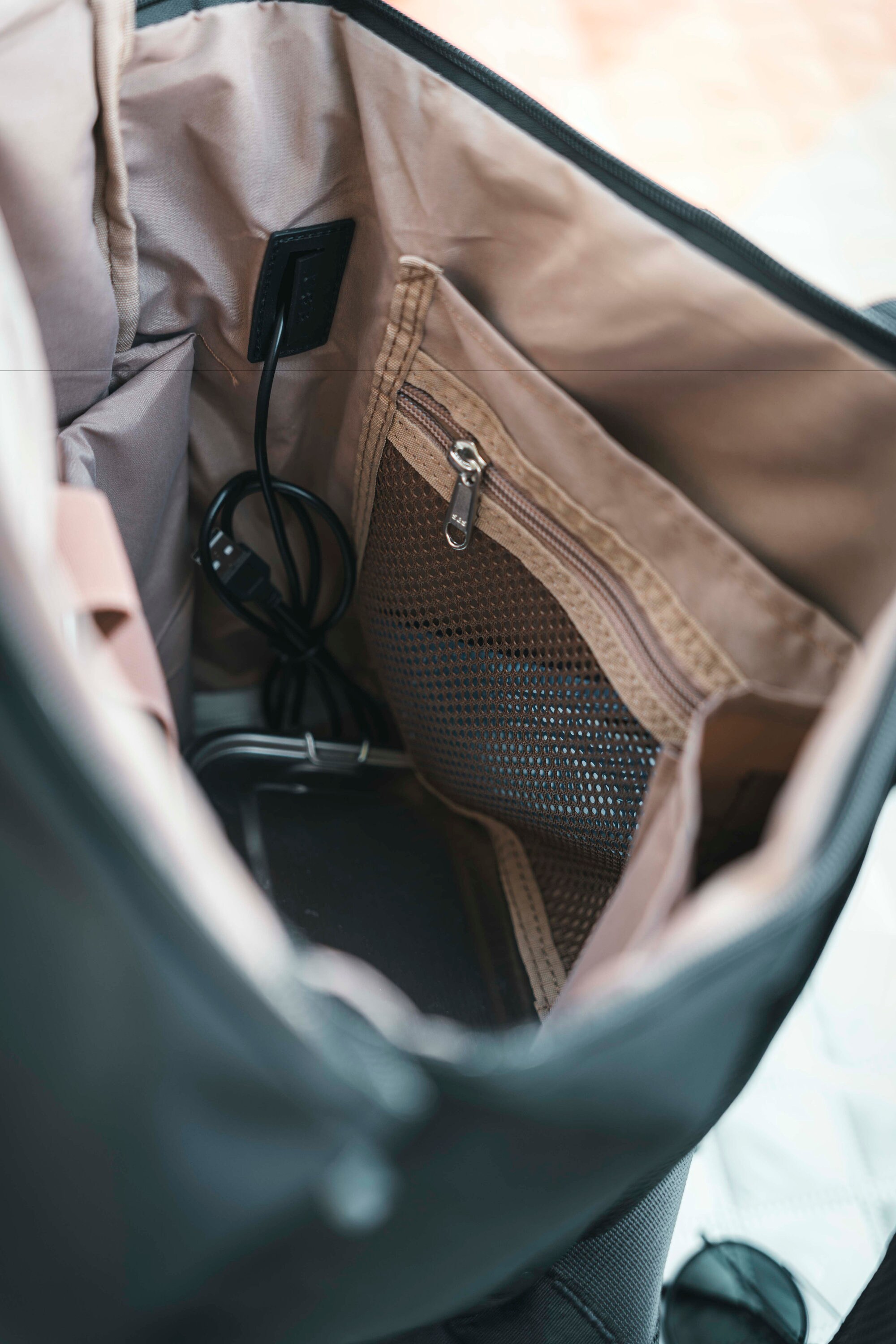 The practical zippered compartment on the front allows quick access to frequently used items, while the external USB-A cable offers the option of conveniently connecting a power bank to charge devices on the go.