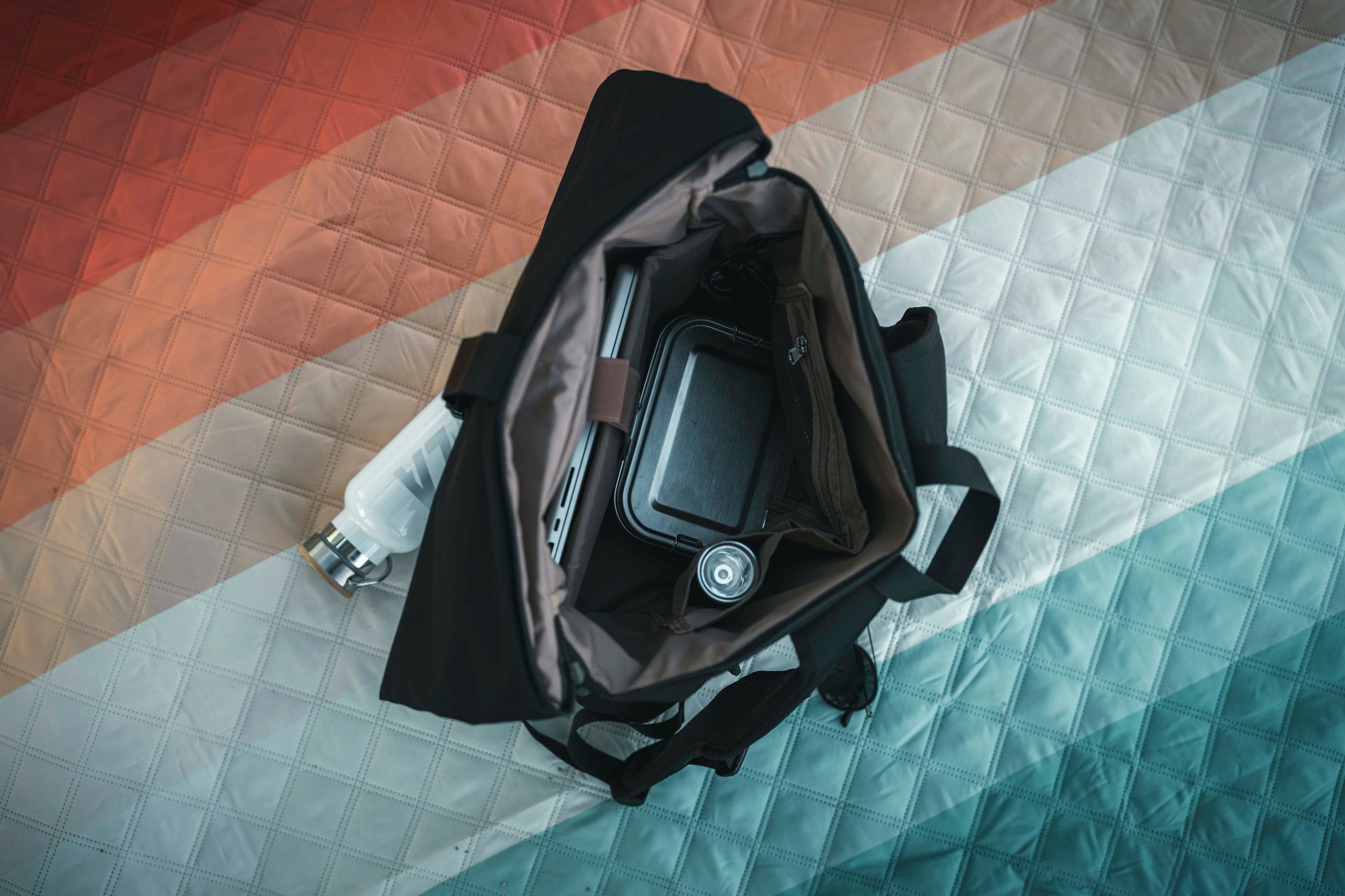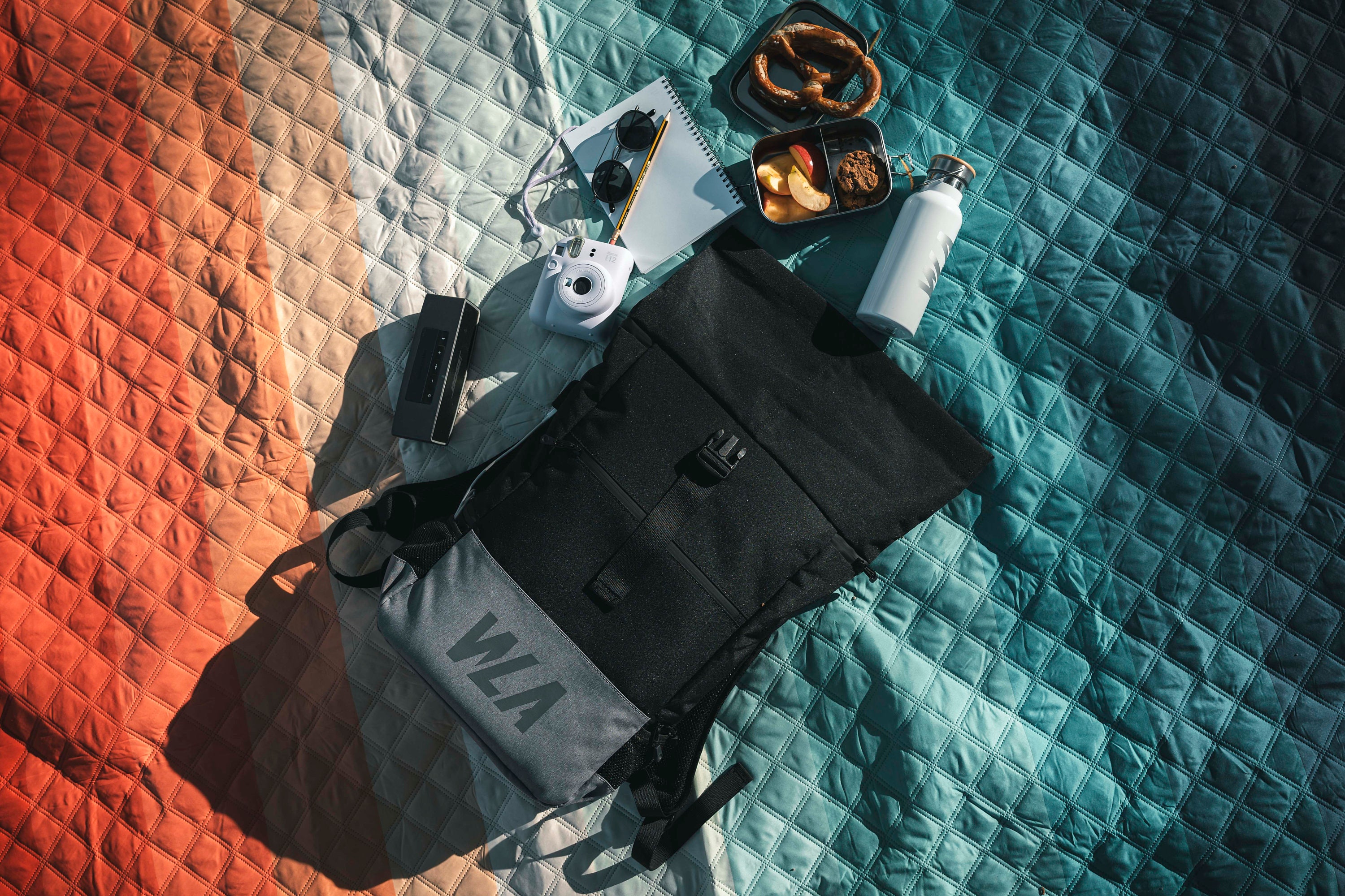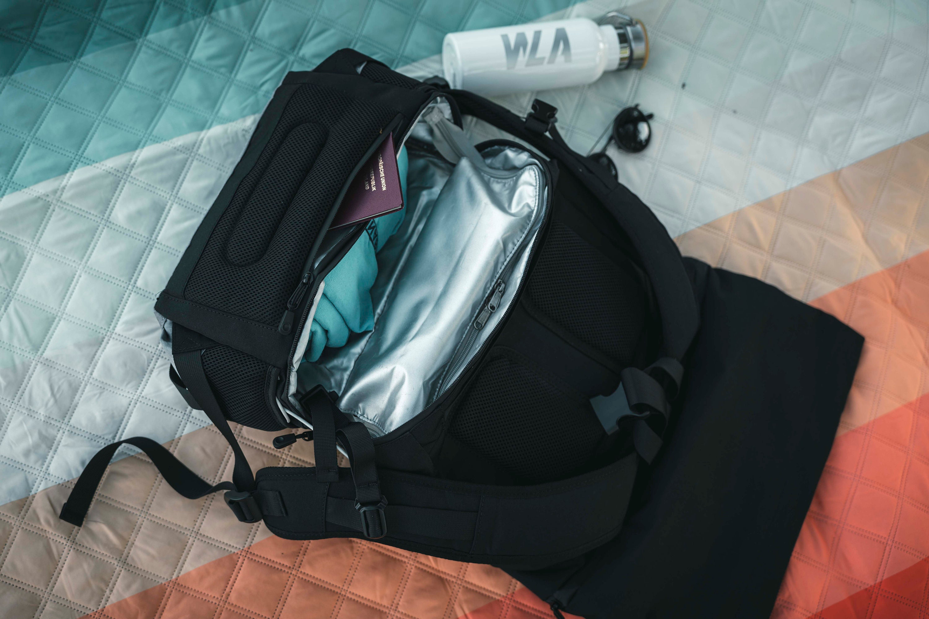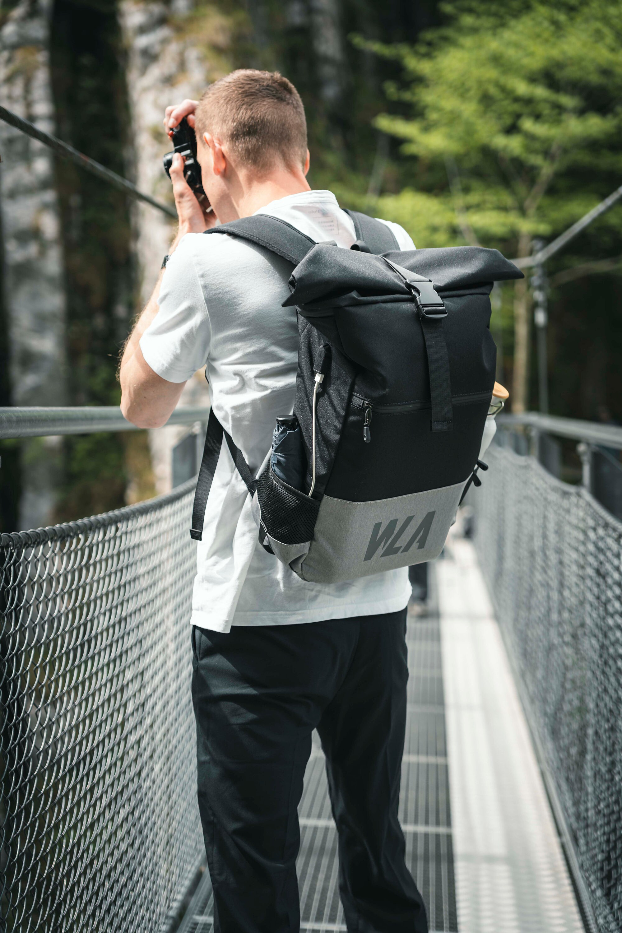 The size can be adjusted in height by rolling it out. The main compartment is secured with snap fasteners and a quick-release buckle. The wide shoulder straps and chest strap ensure optimal comfort, while the padded back section offers a pleasant wearing experience.