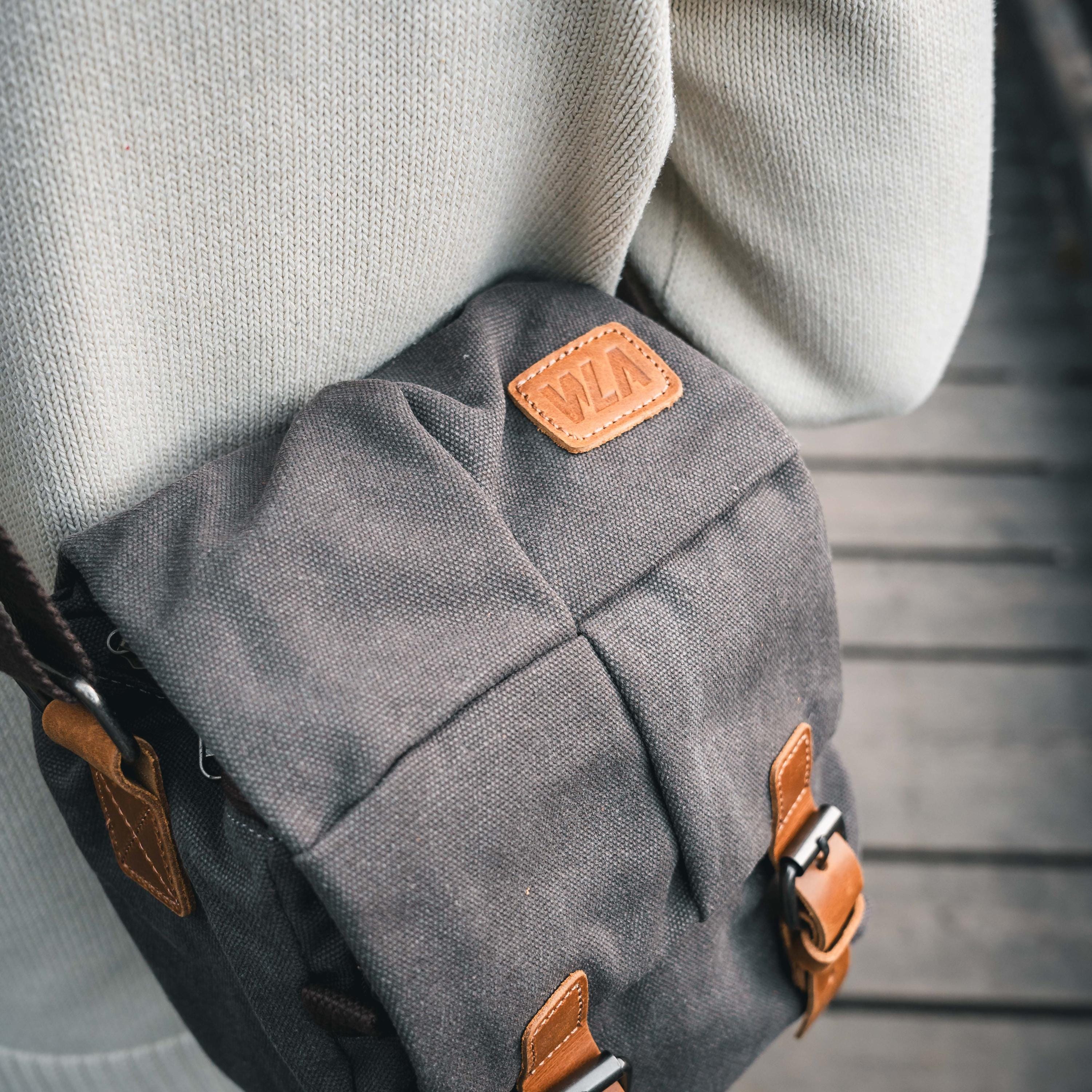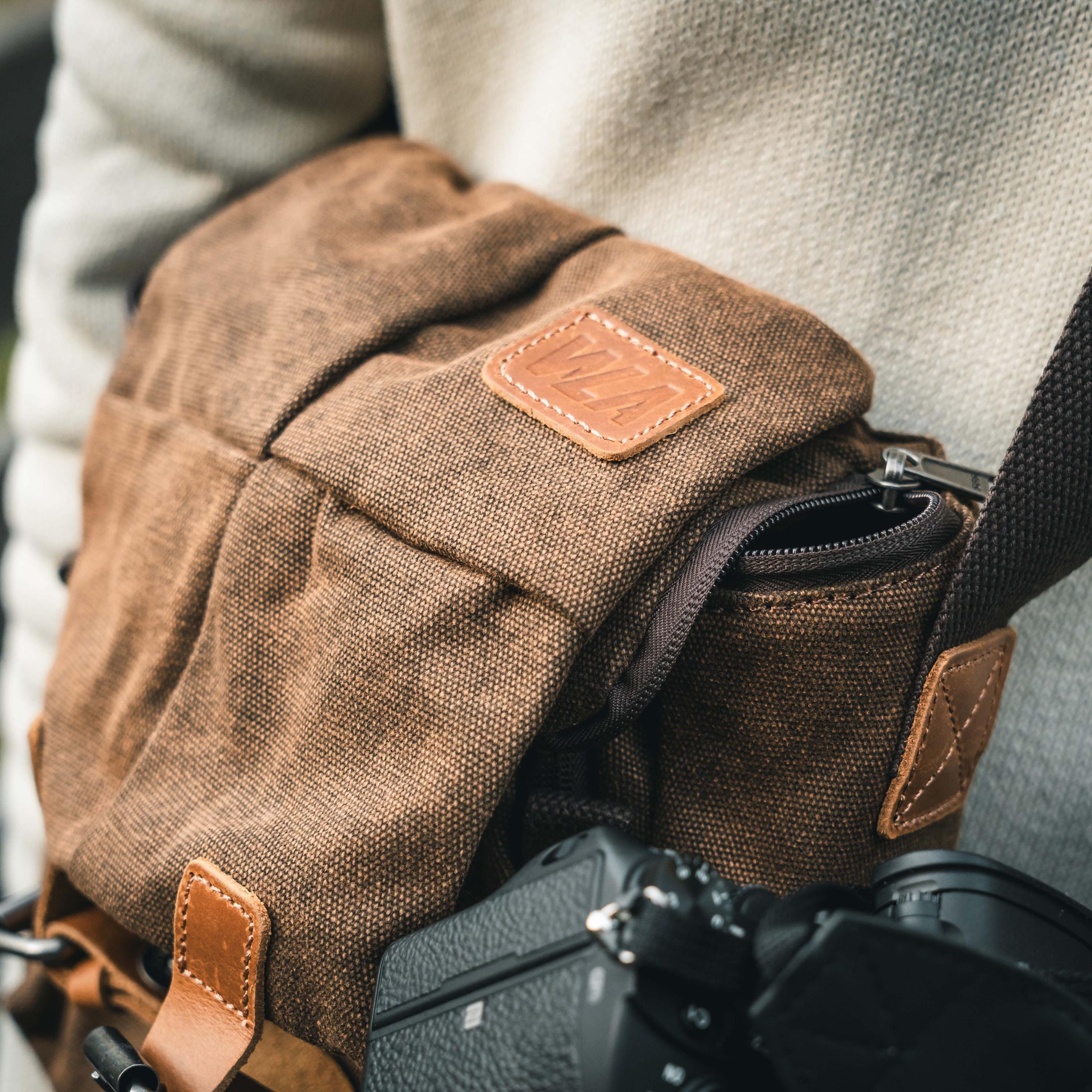 The WLA camera bag in light gray or brown combines looks and functionality. The main material, made of twill canvas, is water-repellent and protects the contents from wind and weather. The zipper and the "lid" with two stylish magnetic buckles close the main and side compartments. This allows for the camera and lens to fit an additional lens, flash, or other accessories. The main compartment can be easily divided into three compartments using two Velcro dividers. This keeps the camera and accessories separate and protected at all times. The front pocket features additional storage compartments for batteries, memory cards, and other items.